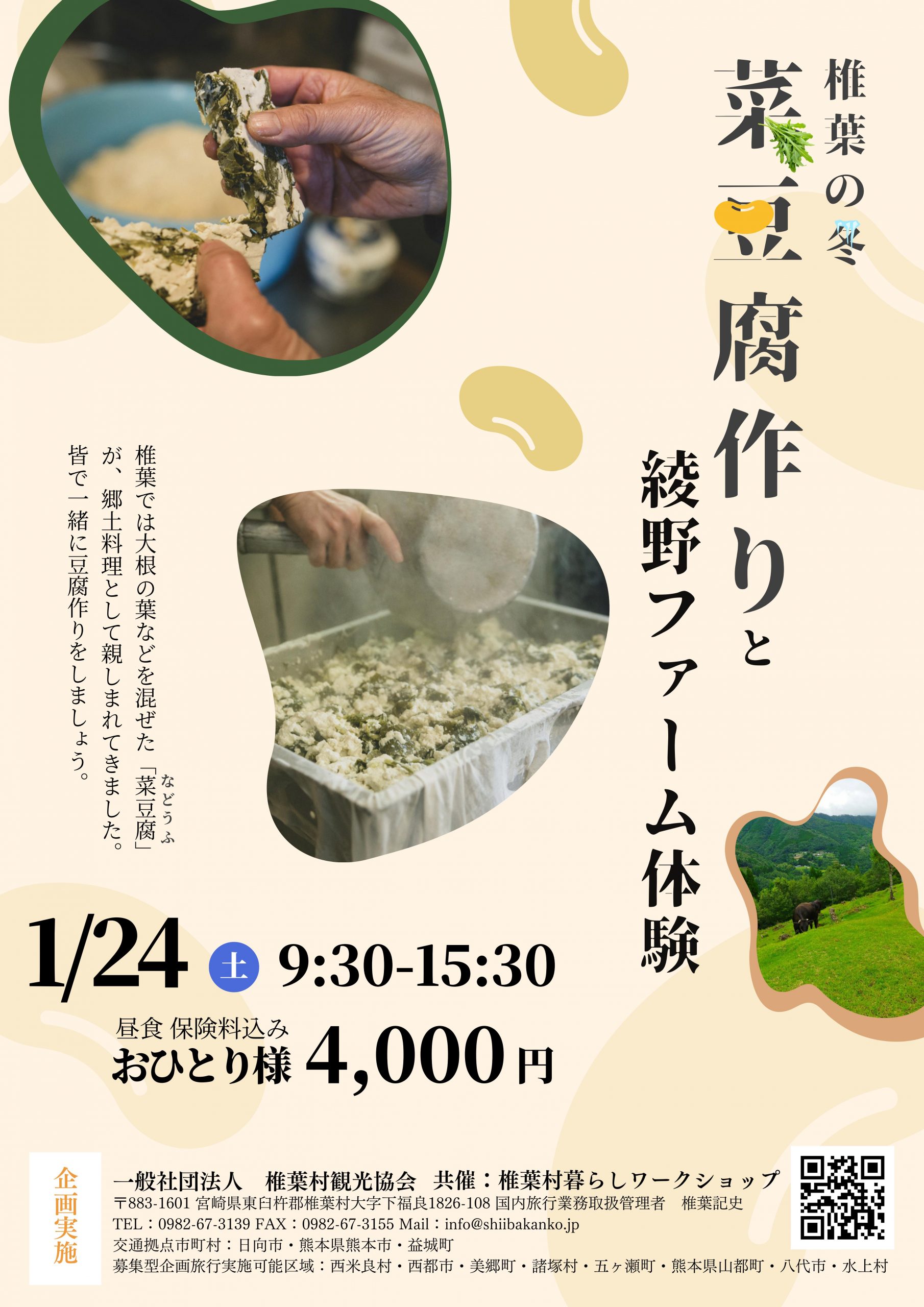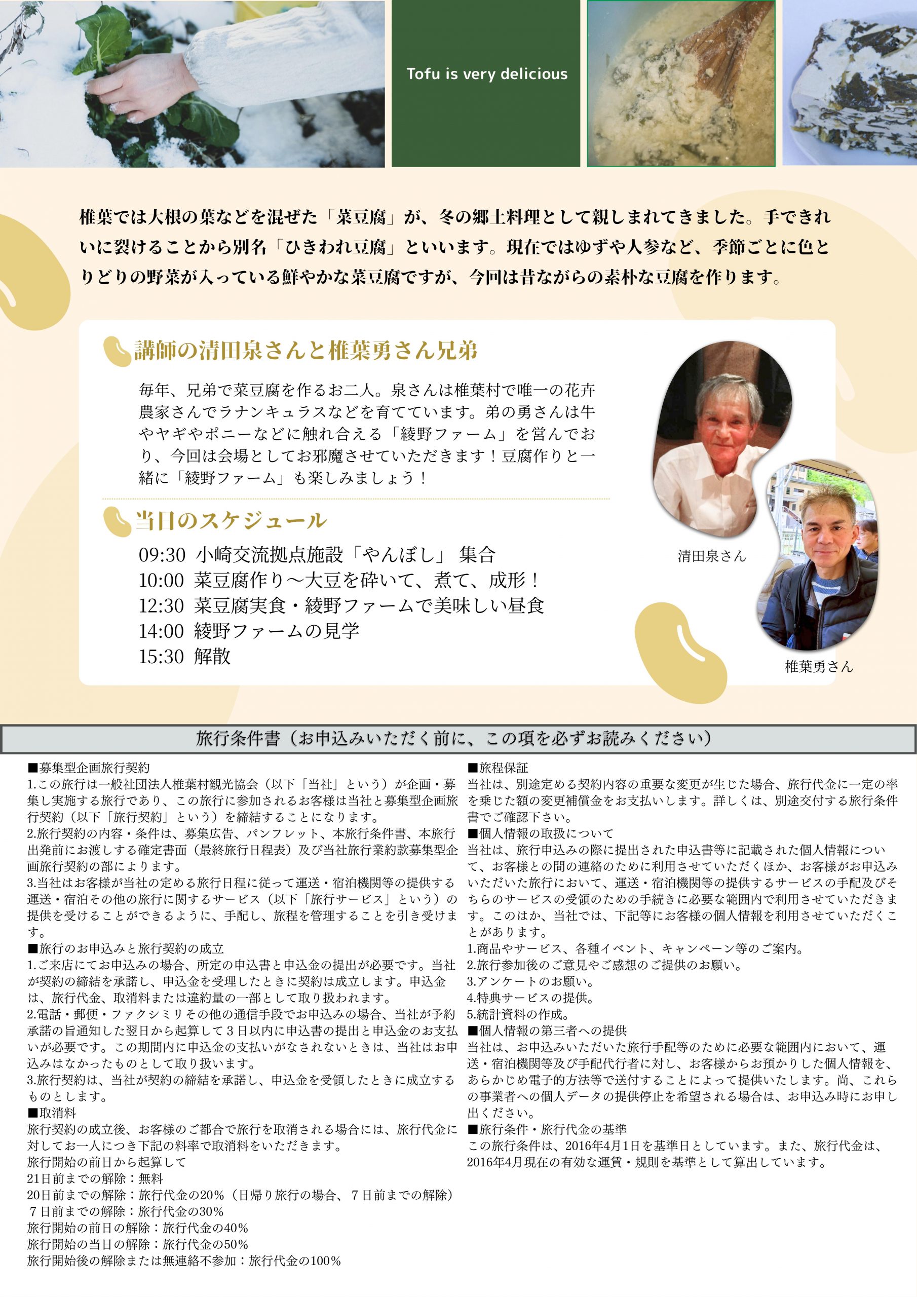 椎葉では、春になると菜豆腐が作られる。藤や菜の花・人参・大根葉などを豆腐に入れて作るもので、昔から冠婚葬祭時に用いられてきました。