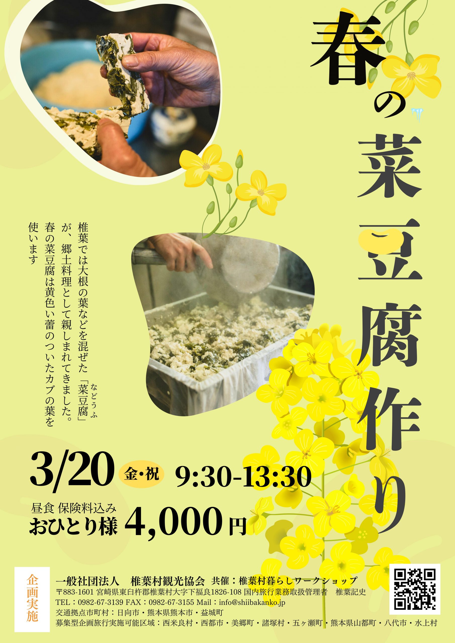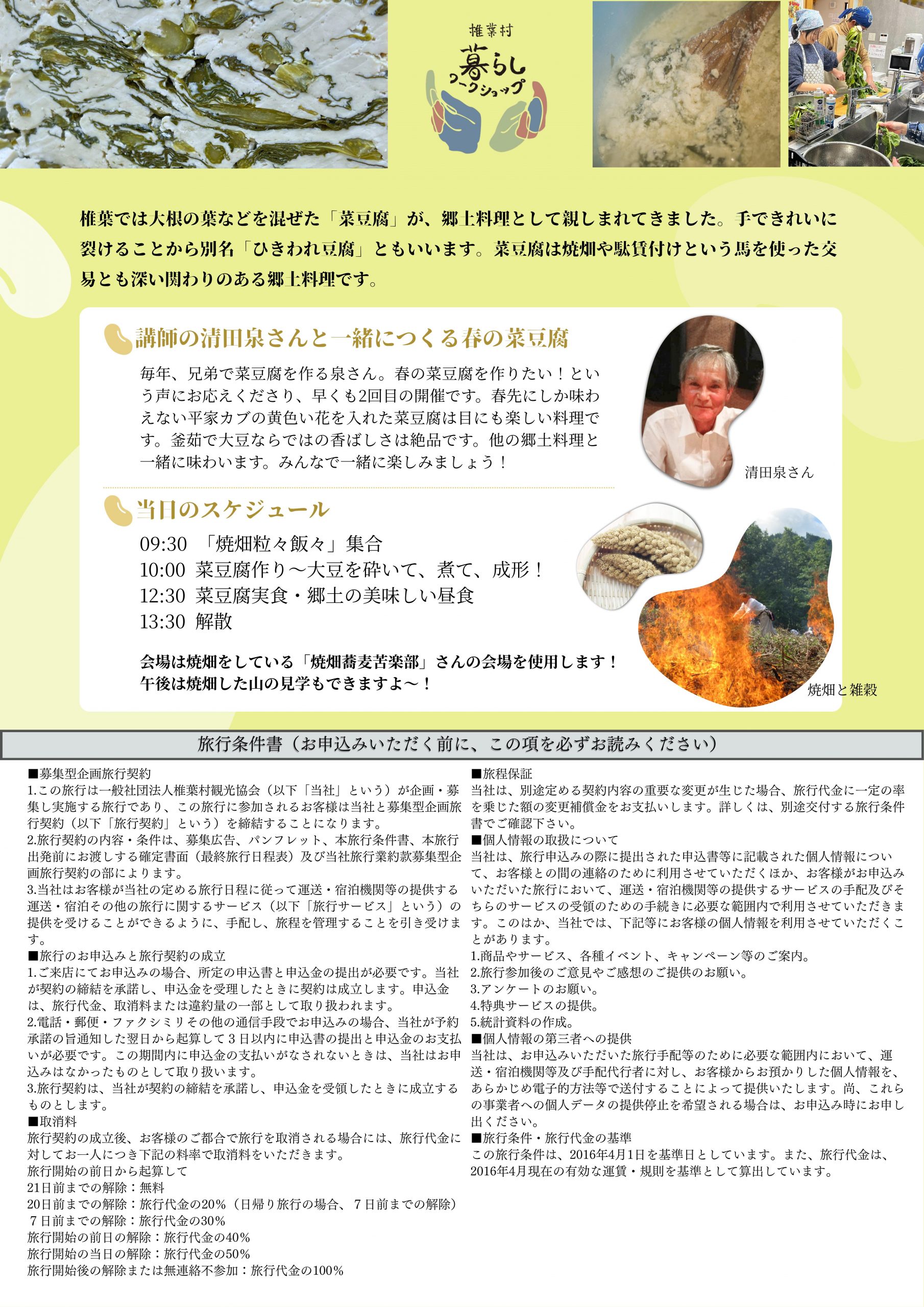 椎葉では、春になると菜豆腐が作られる。藤や菜の花・人参・大根葉などを豆腐に入れて作るもので、昔から冠婚葬祭時に用いられてきました。