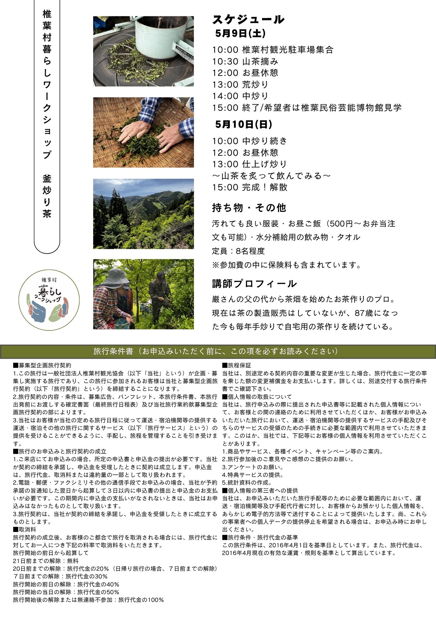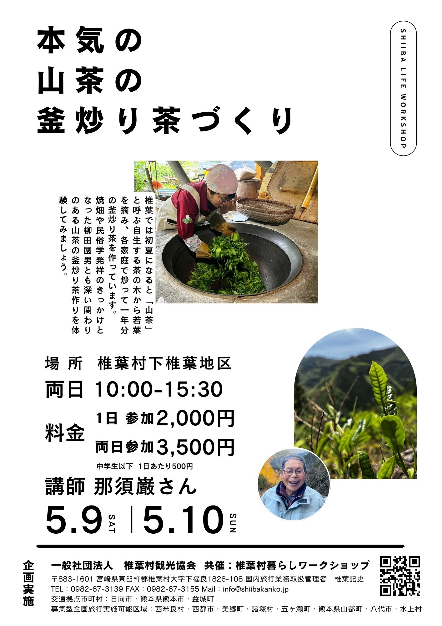 宮崎県椎葉村に自生する「山茶」を使い、伝統的な釜炒り製法による茶作りを体験するワークショップです。昔から毎年初夏になると各家庭で1年分のお茶が作られていました。行う家の数は減ったものの現在でも続く椎葉村の大切な文化です。今回は焼畑や民俗学発祥のきっかけになった柳田國男の椎葉来村とも深い関わりのある山茶を作りながら、自然と人の営みが循環する暮らしを学びます。