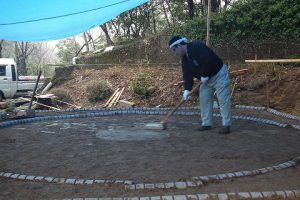 明日からは天気が良くなるということで、今日は白線を引くのをあきらめ、土俵の周りを仕上げます。